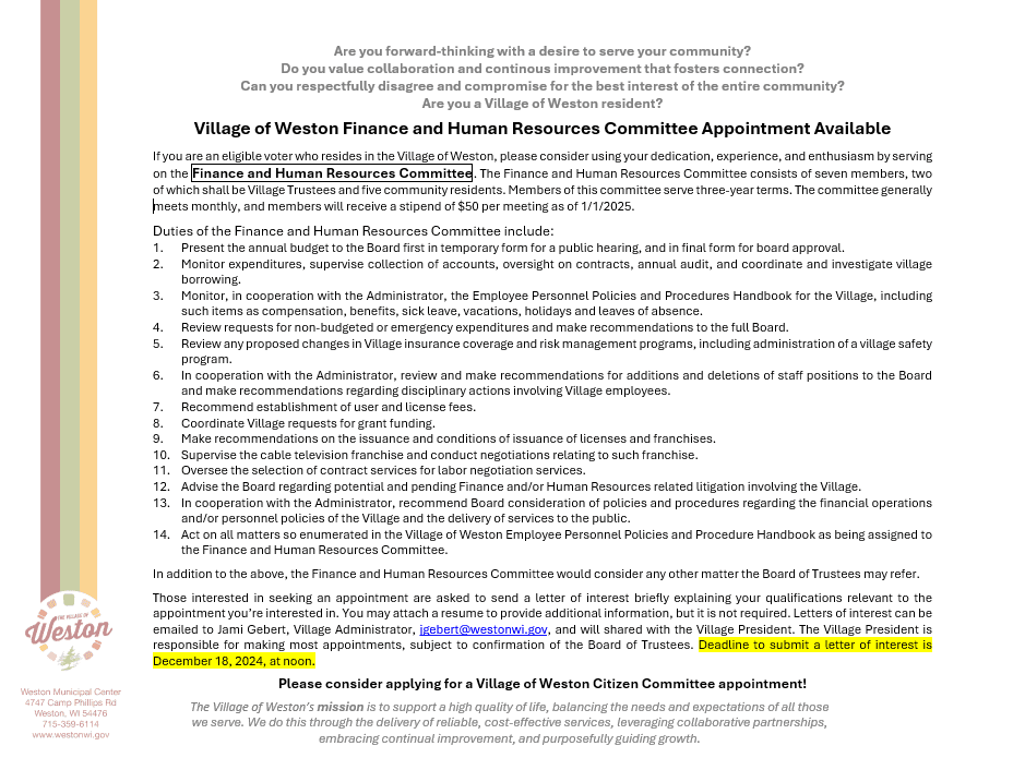Are you interested in running for office in the Village of Weston? Running for an elected office is an excellent way to make a difference in your community. In 2025, the Village of Weston will have four positions on the spring ballot. Those positions are for three Trustees and Village President.